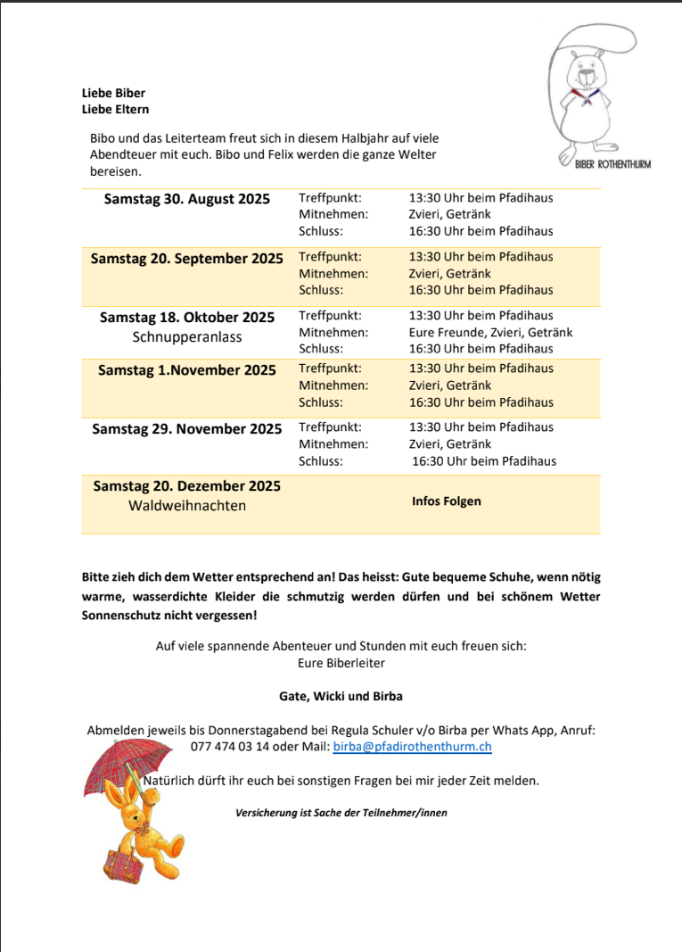 Wenn nicht anders kommuniziert, ist Treffpunkt immer beim Pfadihaus Rothenthurm um 13:30 Uhr mit dem Wetter angepasster Kleidung.