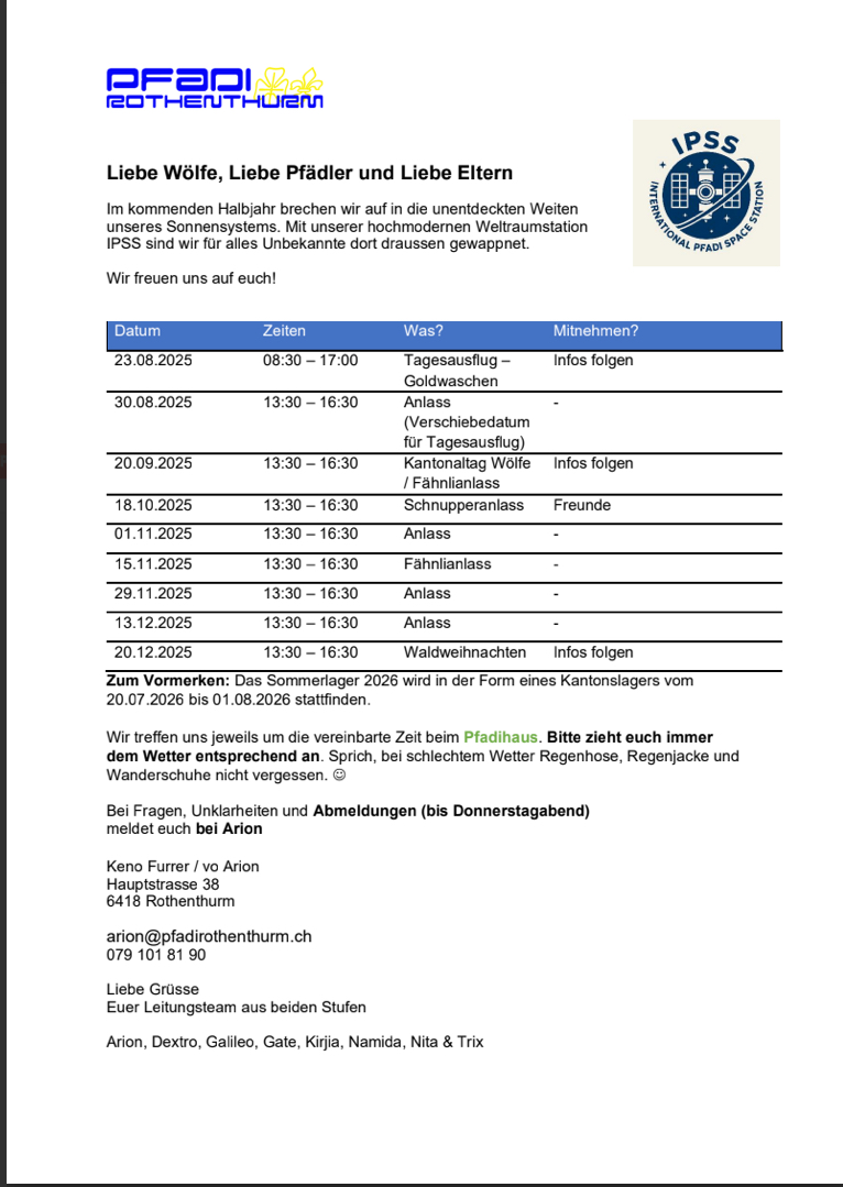 Für allgemeine Fragen steht die Abteilungsleitung der Pfadi Rothenthurm Dir gerne zur Verfügung.